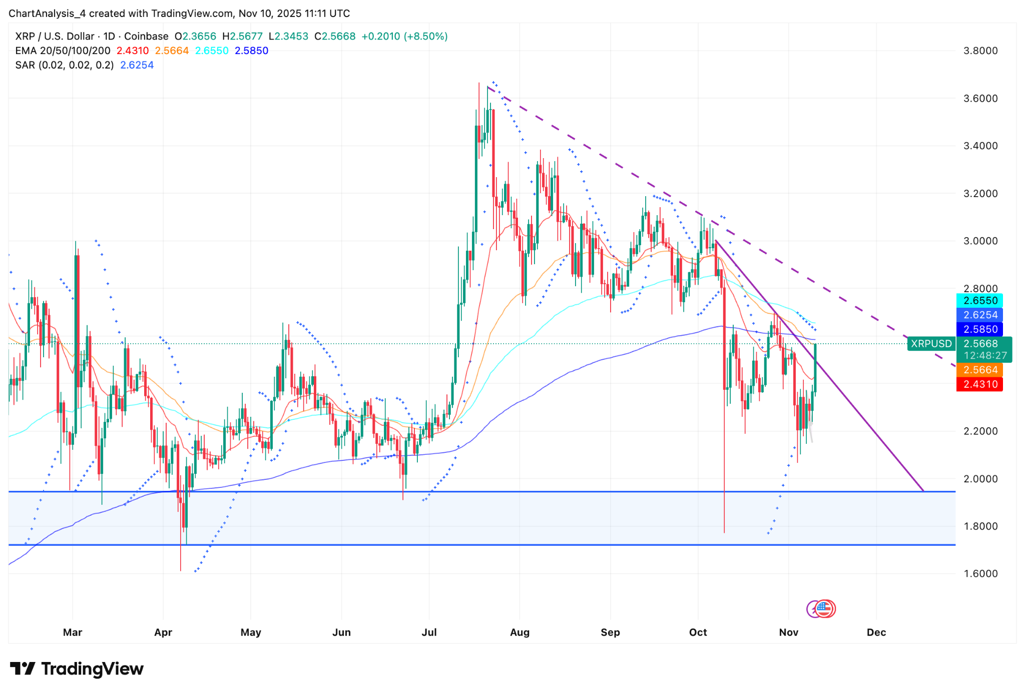 日足チャートでXRPは2.43ドルから2.65ドルの主要なEMAクラスターに入り、このレンジは9月以降ブレイクアウトの試みをすべて跳ね返している。