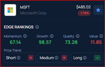 BenzingaのEdgeランキングは、Microsoftの成長面での強いパフォーマンスを反映し、品質面で73パーセンタイル、成長面で99パーセンタイルに位置付けている。詳細レポートはこちら。
