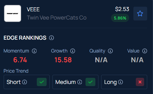 BenzingaのEdge Stock Rankingsによると、VEEEは中期および短期的な上昇傾向とともに、長期的な統合を経験している。その勢いが他の有名銘柄とどう重なるかを確認しよう。