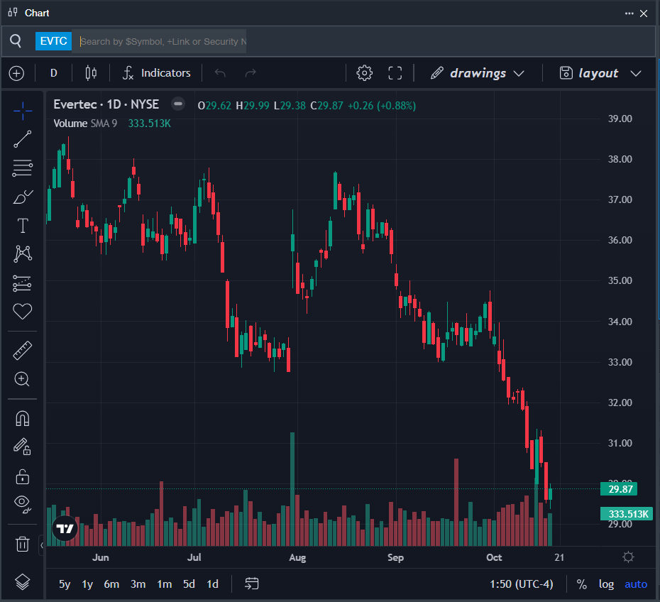 - EVTCの株価動向:9月29日(金)、Evertecの株価は0.9%上昇し、29.87ドルで取引を終えた。