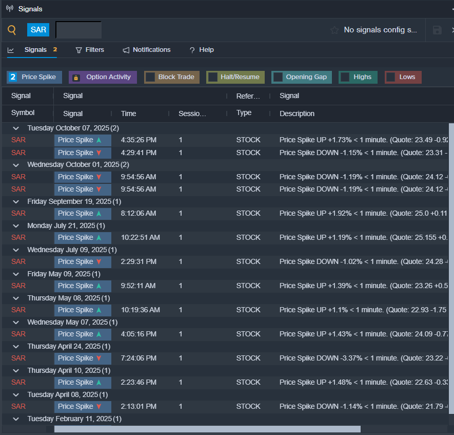 - Benzinga Proのシグナル機能によりSAR株の潜在的なブレークアウトを通知した。