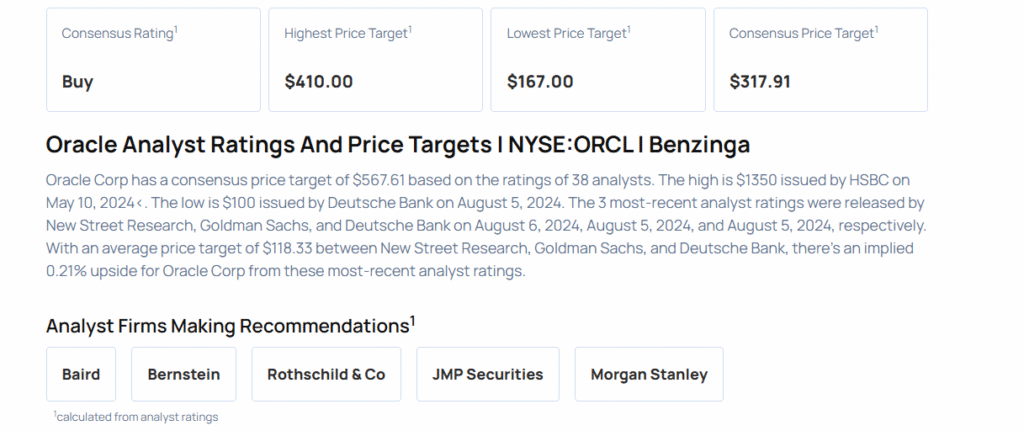 - BairdのアナリストであるRob Oliverは、Oracle Corp(NYSE:ORCL)のカバレッジをOutperform評価で開始し、365ドルの価格目標を発表した。水曜日のオラクル株は288.63ドルで取引を終えた。この株を他のアナリストがどう見ているか。