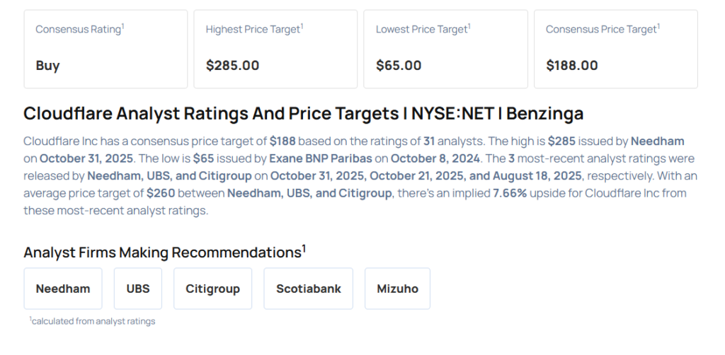 - NeedhamのアナリストであるMike Cikosは、CloudflareをBuyで評価し、株価目標を240ドルから285ドルに引き上げた。