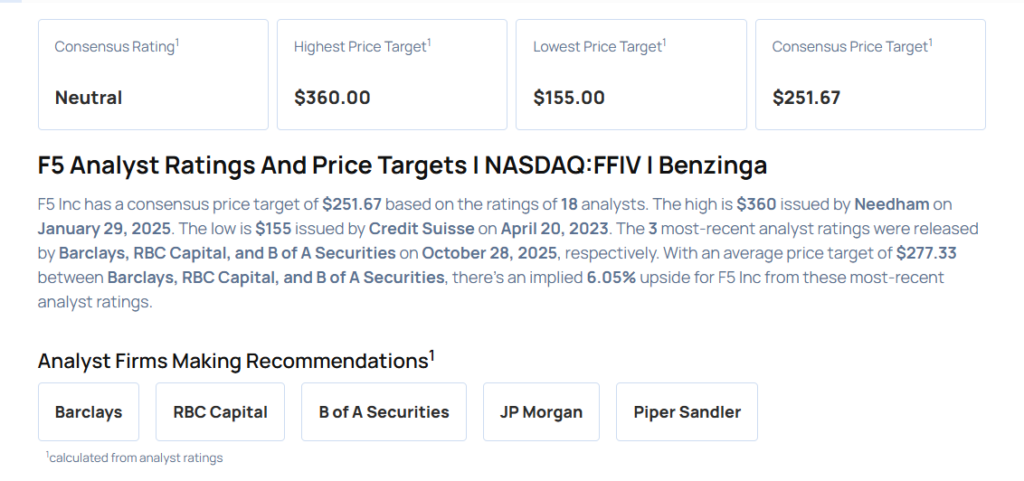 - バンク・オブ・アメリカ証券のアナリストであるタル・リアニは、F5の格付けをUnderperformで維持したが、価格目標を260ドルから250ドルに引き下げた。