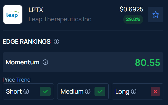 BenzingaのEdgeストックランキングによると、LPTXは短期および中期的には上昇モメンタムにあるが、長期的には統合が進んでいる。他の有名な銘柄と比較して、どう違うのか見てみよう。