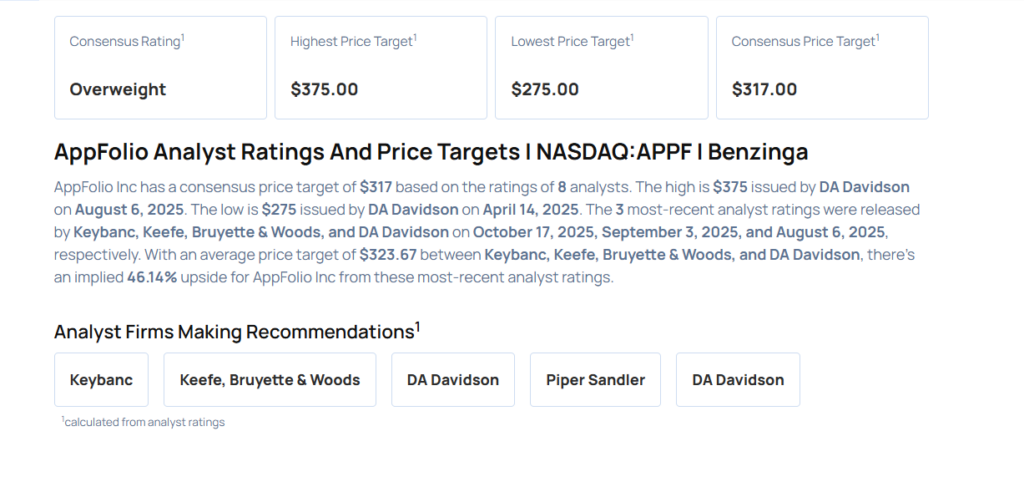 - KeybancのアナリストJason Celinoは、AppFolio Inc(NASDAQ:APPF)のレーティングをSector WeightからOverweightに格上げし、価格目標285ドルを発表した。AppFolioの株価は木曜日に223.31ドルで取引を終えた。 他のアナリストがこの株をどう見ているかはこちら。