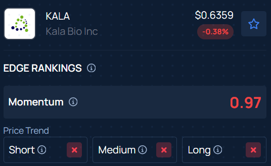 BenzingaのEdge株ランキングによると、KALA株はすべてのタイムフレームで価格が下落傾向にある。その他のパラメーターでの株のパフォーマンスはこちら。