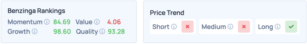 BenzingaのEdgeストックランキングによると、エヌビディア株は長期的に見て価格動向が有利で、モメンタム、成長、クオリティの各項目で高得点を獲得している。株がAMDとどのように比較されるかはこちら。