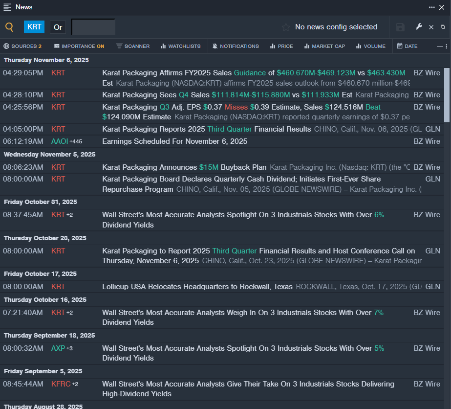• 最近のニュース:11月6日、Karat Packagingは第3四半期の業績が弱かったことを発表。