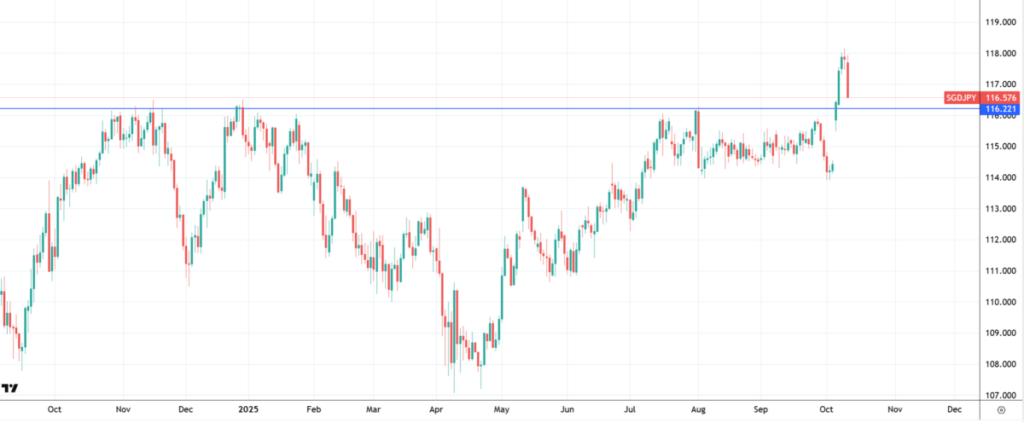 一方、日本円は逆の展開を示した。週の初めに、USD/JPYは2%以上上昇し、150.47となった(8月以来の高値)。この上昇は、日本の与党である自由民主党が安倍ノミクス型の財政支援と金融緩和政策に賛同する高市早苗を選出したことを反映したものである。トレーダーは短期的な日銀の引き上げ観測を控えめにし、債券利回り曲線の長短差が拡大し、円に下押し圧力をかけた。日銀の慎重な楽観主義と、企業利益に対する関税リスクに関する通知により、円にとっては週の初めに「経済指標の発表を待つ」という姿勢が強化された。