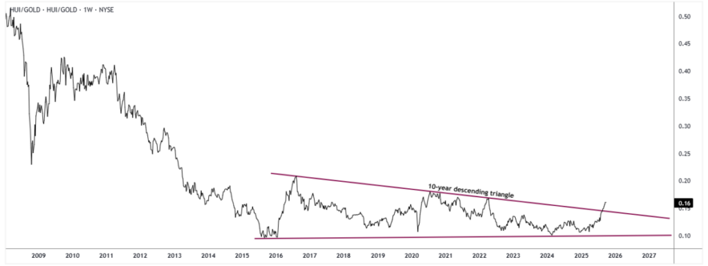 もし金採掘企業が何年もの間低迷し続け、いつか本格的に上昇しはじめるのか疑問を抱いていたなら、その答えがついに明らかになったかもしれない。2025年9月初旬、HUI指数と金価格の比率が10年にわたる下降トライアングルを決定的に上に抜けた。この構造は2015年以降、採掘企業が金価格をアウトパフォームする試みをことごとく阻んできた。このブレイクアウトは、この10年間にわたりこの業界を定義づけてきた長期圧縮の終わりを示し、新たな展開への道を開いた。