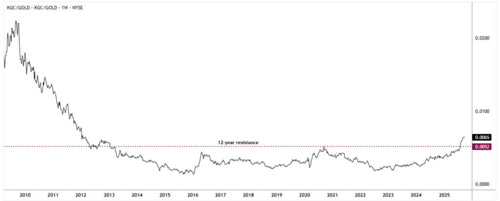 キンロス・ゴールド(NYSE:KGC)は、12年にわたるレジスタンスレベルを上回る急騰を見せ、長期間にわたって続いてきたパフォーマンスの低さに終止符を打ち、投資家の信頼の決定的な変化を示した。バリック・ゴールド(NYSE:GOLD)は5年にわたる下落トレンドを突破し、最後の強気サイクル以来保持していなかった地位を回復した。