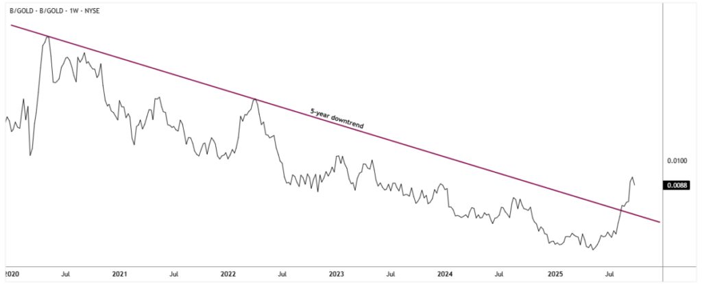 決定的な瞬間は2025年9月初旬に訪れた。その時、HUI/金比率は2016年以降のすべてのラリーの試みを阻んできた下降供給ラインを突破した。すぐに消えていった過去の動きとは異なり、このブレイクアウトは揺るぎなかった。週足終値はブレイクアウトラインの上に残り、早期のブル派をしばしば罠に陥れる「急騰後の急落」を回避した。この弾力性は構造的ブレイクアウトの証であり、需要が供給を吸収していること、市場が金の延べ棒に対して採掘企業の再評価の準備ができていることを示している。